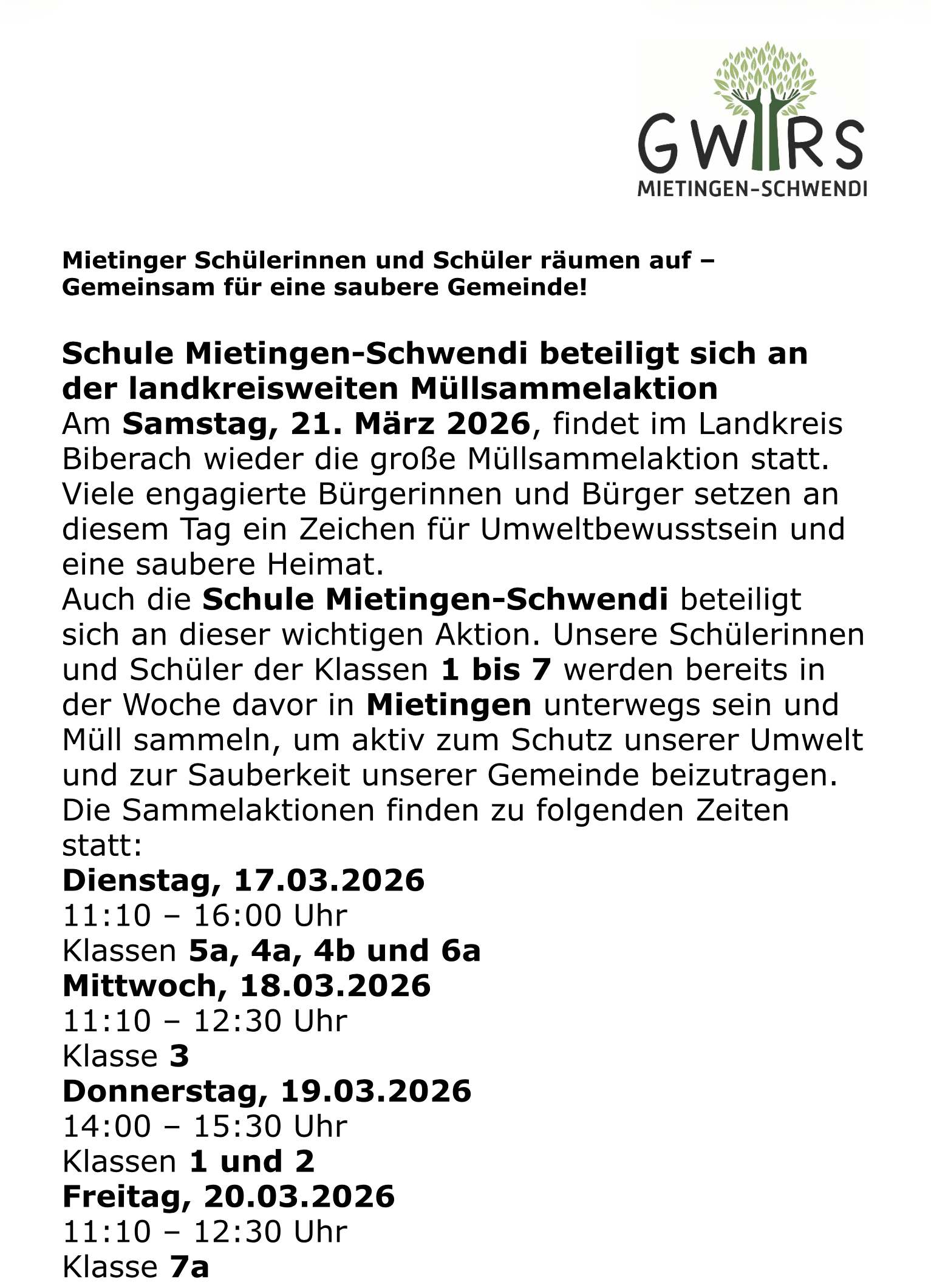 Unsere Schülerinnen und Schüler sind in dieser Zeit im Gemeindegebiet Mietingen unterwegs.