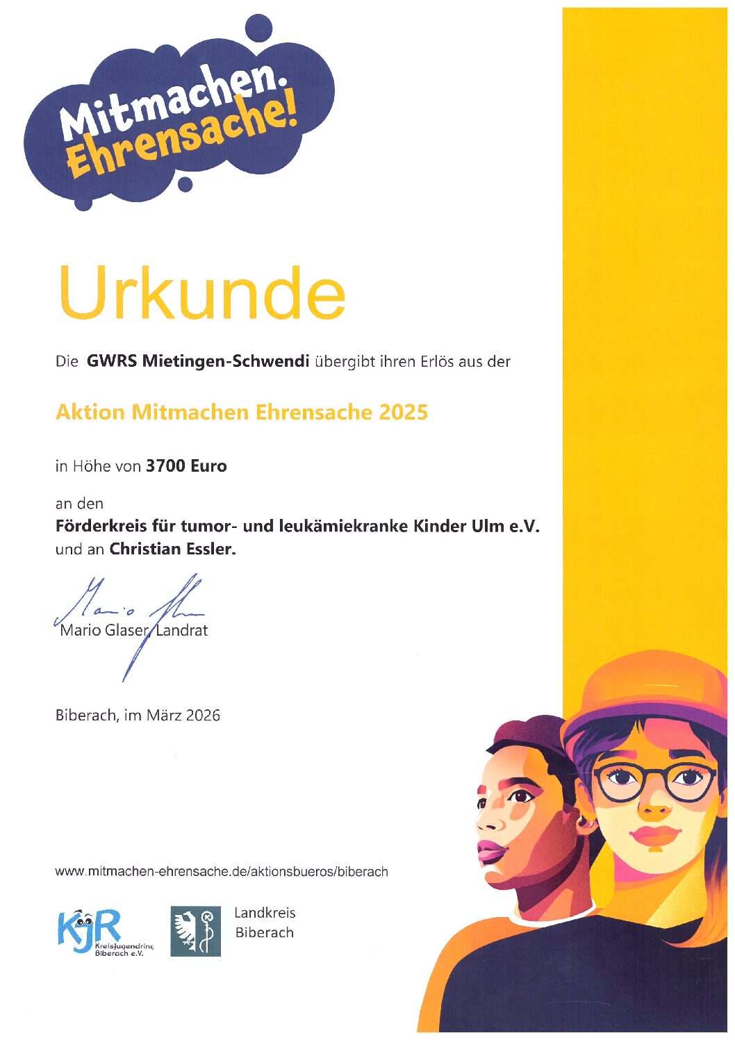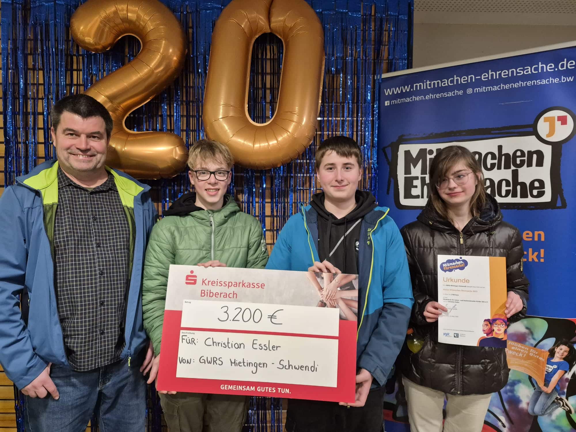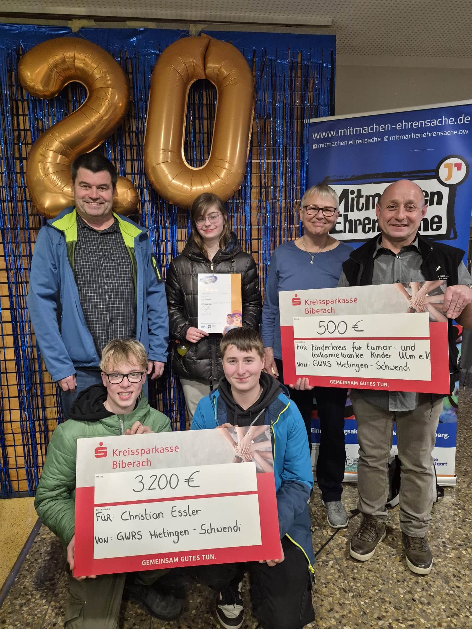 Die Jugendlichen der GWRS Mietingen-Schwendi hatten sich dafür entschieden, dass 3200 € an den ehemaligen Schüler Christian Essler gehen, der leider schwer erkrankt ist und aktuell im Rollstuhl sitzt. Auf diesem Wege wünschen wir ihm ganz viel Kraft für seinen weiteren, sicherlich nicht ganz einfachen Weg. Weitere 500 € gingen an den Förderkreis für tumor- und leukämiekranke Kinder Ulm e. V.
